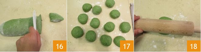 Divida a massa com uma espátula 16 em 11 bolinhas do mesmo tamanho 17. Achate cada bolinha com um rolo para formar um disco 18.