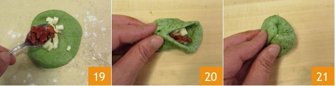 Recheie cada disco com os cubos de queijo e os tomates 19, depois feche a massa como uma trouxinha 20 para obter novamente a forma de uma bolinha 21.