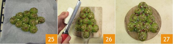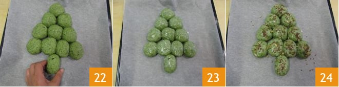 Coloque as bolinhas em uma assadeira forrada com papel manteiga formando uma árvore 22. Pincele a superfície com o leite 23 e decore com as sementes mistas 24.