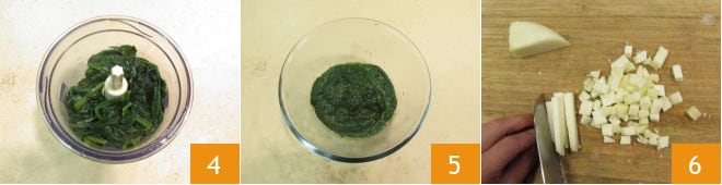 Transfira o espinafre cozido para o copo do mixer 4 e bata até obter uma mistura homogênea e bem picada 5. Corte o queijo em pequenos cubos 6.