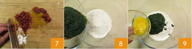 Pique os tomates secos escorridos do óleo de conserva 7. Agora coloque a farinha em uma tigela grande, adicione a purê de espinafre 8 e a gema 9.