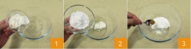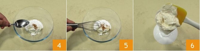 Para preparar as tâmaras recheadas com mascarpone e nozes, comece colocando em uma tigela grande o mascarpone 1 e o açúcar de confeiteiro 2. Aromatize com a canela 3.