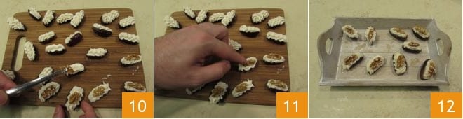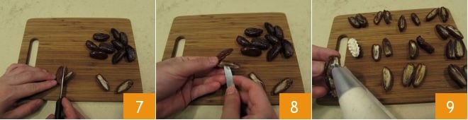 Deixe o saco de confeitar de lado enquanto se dedica à preparação das tâmaras. Comece cortando-as ao meio 7: repita a operação para todas as tâmaras. Em seguida, remova os caroços internos 8: assim, você obterá tâmaras em forma de barco que estarão prontas para serem recheadas. Pegue o saco de confeitar e comece a preencher o interior das tâmaras 9.