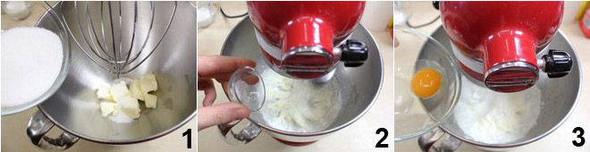 Para preparar as dentaduras, bata a manteiga em temperatura ambiente cortada em pedaços na batedeira junto com o açúcar 1 até obter um composto claro e espumoso. Adicione a pitada de sal 2 e o ovo 3. Continue a bater até que todos os ingredientes estejam bem incorporados.