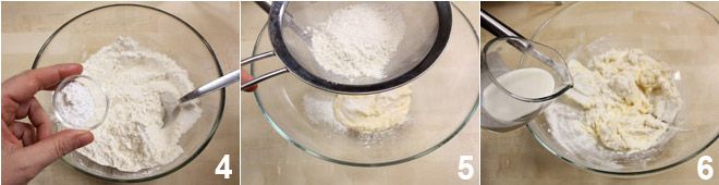 À parte, em uma tigela, misture a farinha com o fermento 4 e o amido de batata. Transfira o composto de manteiga, açúcar e ovo para outra tigela e peneire por cima as farinhas 5, incorporando-as com uma espátula de baixo para cima e misturando enquanto adiciona, em fio, o creme de leite e, por último, as sementes da fava de baunilha 6.