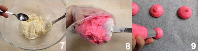 Por último, adicione o corante alimentício, o suficiente para obter um rosa forte 7. Transfira a massa obtida para um saco de confeitar 8 com bico liso de diâmetro de 1,5-2 cm e pressione montinhos de massa de 4 cm de diâmetro e pelo menos 2 cm de altura em uma assadeira forrada com papel manteiga 9. Asse em forno estático pré-aquecido a 180°C por cerca de 13-14 minutos, depois retire e deixe esfriar os whoopies coloridos.