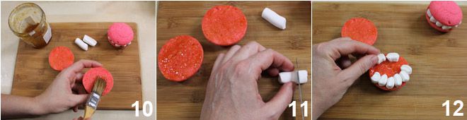 Quando estiverem bem frios, pincele abundantemente a parte plana dos discos com a geleia de damasco 10. Depois, corte os marshmallows em cilindros de 1 cm de espessura dos quais, com uma faquinha, você obterá quadradinhos: você terá obtido os dentes para as dentaduras 11. Coloque os dentes de marshmallow ao longo do perímetro de 8 discos (você pode cobrir todo o perímetro ou apenas metade dele, como na foto, colocando apenas dois cubinhos na parte traseira como suporte) 12, então feche como um sanduíche com os discos restantes e deixe secar tudo. Suas dentaduras estão prontas, feliz Halloween!!!