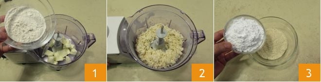 Para preparar os diamantes de cacau e amêndoas, comece colocando a manteiga fria em pedaços e 230 g de farinha tipo 00 em um processador 1. Acione as lâminas até obter uma mistura arenosa 2 e reserve em uma tigela grande. Pegue uma outra tigelinha para misturar o açúcar de confeiteiro e a farinha de amêndoas 3,