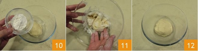 Na outra, adicione os 20 g de farinha 00 restantes 10 e amasse-a na mistura com a ajuda das mãos 11 até obter uma massa lisa e homogênea 12.