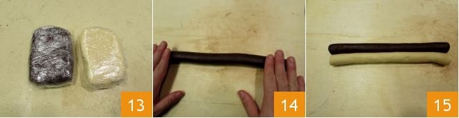Neste ponto, você terá obtido duas massas: embrulhe cada uma com filme plástico transparente 13 e coloque na geladeira para descansar por pelo menos 2 horas e meia. Após o tempo de descanso, divida cada massa em duas partes iguais e comece a criar um rolo longo com a ajuda das mãos 14, até formar um cilindro de cerca de 3 cm. Repita a operação com os outros 3 pedaços de massa restantes 15.