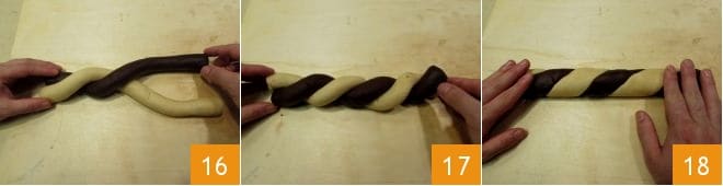 Agora, pegue um cilindro de cacau e um de farinha simples e coloque-os lado a lado: entrelace-os sobrepondo um rolo no outro 16 até chegar ao final dos rolos 17: enrole o rolo bicolor obtido, pressionando e alongando levemente com a pressão das mãos até obter um novo rolo de cerca de 3 cm de diâmetro 18. Repita a operação com os outros dois rolos.