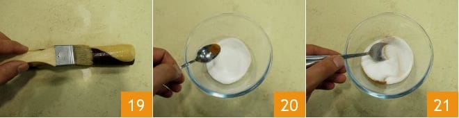 Pincele os rolos obtidos com um pouco de água à temperatura ambiente 19. Depois, em uma tigelinha, adicione a canela ao açúcar 20 e misture os ingredientes 21.