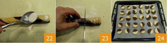 Polvilhe os rolos com a mistura obtida de açúcar e canela 22 e corte os cilindros em discos de 7 mm de espessura 23, que você colocará em uma assadeira forrada com papel manteiga. Asse em forno estático pré-aquecido a 160°C por 20 minutos (para esses biscoitos, desaconselhamos o uso do forno ventilado ou, no máximo, recomendamos testar o cozimento de algumas peças como a primeira fornada para verificar o tempo e a temperatura para as seguintes). Uma vez que seus diamantes de cacau e amêndoas estejam assados, retire-os do forno 24, deixe esfriar um pouco e saboreie!