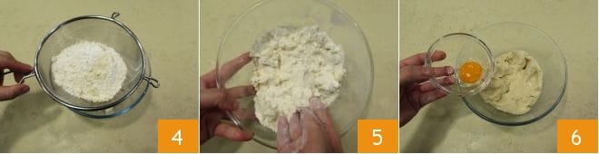 depois peneire-os juntos na tigela onde você colocou a mistura arenosa de manteiga e farinha 4, misturando os ingredientes rapidamente com as mãos 5. Em seguida, adicione o ovo 6 e continue amassando rapidamente com as mãos, até obter uma mistura homogênea e lisa.