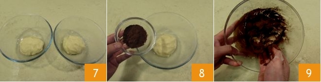Divida a massa obtida em duas tigelinhas diferentes 7: em uma, adicione o cacau 8 e comece a amassar com as mãos 9 até obter uma massa homogênea.