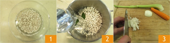 Para preparar a dobradinha com feijão, coloque os feijões cannellini em uma tigela; deixe de molho em água fria por 12 horas 1. Após este tempo, escorra, enxágue e cozinhe-os em uma panela, começando com água fria. Use também folhas de louro 2. O tempo de cozimento será em torno de 1 hora ou 1 hora e 30 minutos: devem ficar macios, mas ainda consistentes. Limpe e pique finamente o aipo, a cenoura e a cebola 3.