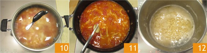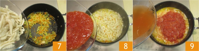 Adicione a dobradinha e deixe refogar por mais 5 minutos 7. Em seguida, adicione os tomates 8 e a água, usando a mesma tigela que continha os tomates 9. Tempere com sal.