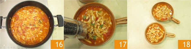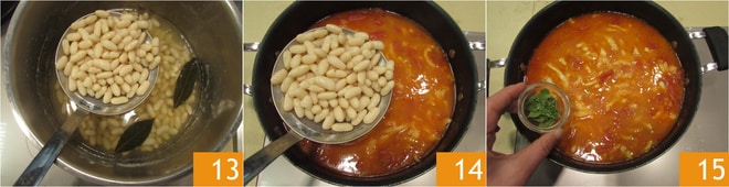 Escorra-os 13 e adicione-os à panela com a dobradinha 14 e tempere com as folhinhas de manjerona 15.