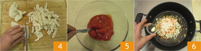 Corte a dobradinha em tiras 4 e enxágue bem em água corrente. Amasse com um garfo os tomates pelados 5. Despeje um fio de azeite em uma caçarola, adicione o aipo, a cenoura, a cebola e o alho 6. Refogue por 5 minutos.