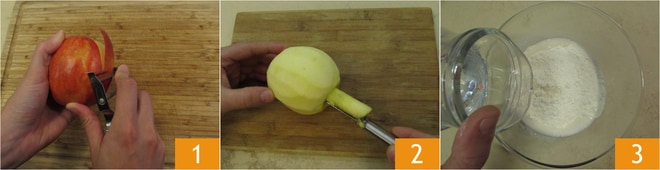 Para preparar o doce com annurcas e zabaione, descasque as maçãs 1 e com uma faca remova o miolo deixando um buraco no centro 2. Em uma tigela misture os biscoitos esmigalhados com os flocos de aveia. Em outra tigela, misture a farinha e a água, aos poucos 3.