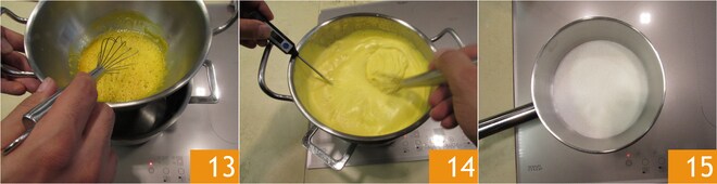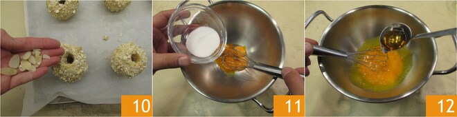Decore a superfície com lâminas de amêndoas 10. Asse em forno estático a 180° por 45-50 minutos, verificando de vez em quando, pois o tempo de cozimento depende do quão suculenta é a maçã. Enquanto isso, prepare o zabaione colocando em uma tigela os ovos e o açúcar 11, misture para incorporar. Adicione aos poucos o marsala 12.