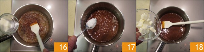 Quando o caramelo estiver com uma cor âmbar, adicione o leite e misture. Desligue e continue mexendo para engrossar, adicione o sal 17 e a manteiga 18.