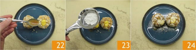 Decore com o caramelo salgado 22 e uma pitada de açúcar de confeiteiro 23. O doce com annurcas e zabaione está pronto para ser saboreado 24.