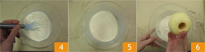 Misture bem com o batedor 4 para criar uma massa lisa e sem grumos 5. Mergulhe as maçãs primeiro na massa de farinha e água 6.