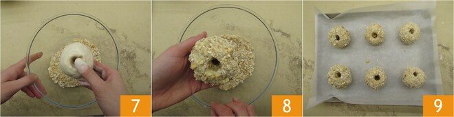Cubra as maçãs com o granulado de biscoitos e aveia 78. Coloque as maçãs em uma assadeira forrada com papel manteiga 9.