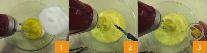 Para preparar a sobremesa rápida e fácil, derreta a manteiga em fogo bem baixo e deixe amornar. Em uma tigela, coloque os ovos em temperatura ambiente e o açúcar 1, misture até obter um composto espumoso, então acrescente os grãos de 1 fava de baunilha 2 e a casca ralada do limão 3.