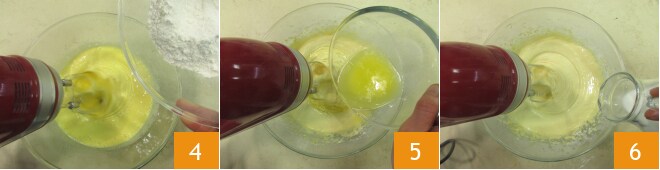Adicione a farinha e o fermento peneirados aos poucos 4, trabalhando sempre com a batedeira. Uma vez que os ingredientes secos estejam incorporados, adicione também a manteiga derretida e morna 5. Quando estiver incorporado, adicione por último o leite em temperatura ambiente 6 e continue misturando.