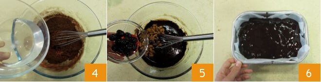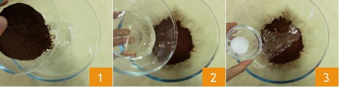 Para preparar o doce vegano de cacau e amarena, despeje em uma tigela o cacau em pó 1, a glicose 2, o sal 3