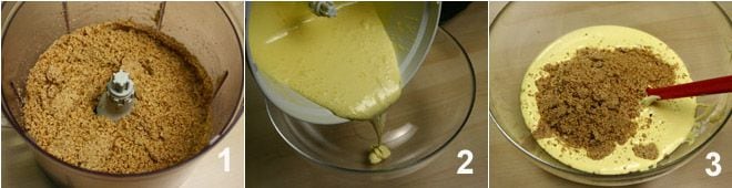 Primeiro, triture em um mixer as amêndoas e as avelãs 1. Depois bata muito bem as gemas dos ovos com metade do açúcar até obter um composto denso e cremoso, então despeje em uma tigela 2. Adicione às gemas batidas a fruta seca triturada 3 e misture tudo.