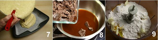 Despeje a massa dentro da forma 7 e coloque no forno já pré-aquecido por 45 minutos a 160 graus. Enquanto o bolo assa, prepare os cremes. Para o recheio, derreta o chocolate, previamente picado grosseiramente com uma faca em uma panela em fogo bem baixo junto com o café 8. Em um mixer, trabalhe a manteiga, com o açúcar de confeiteiro e as gemas 9.