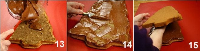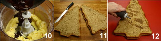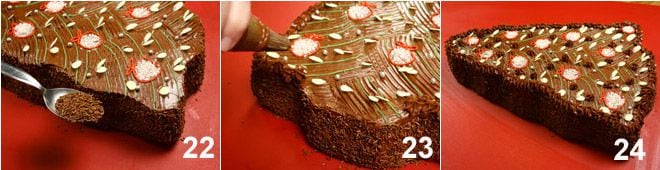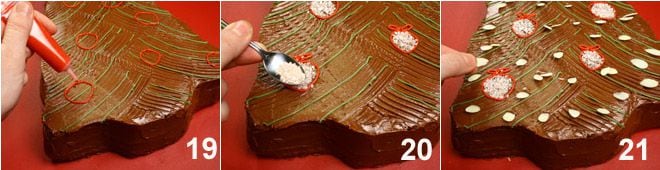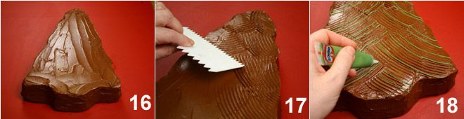 Espalhe o creme de chocolate na superfície 16 e, ajudando-se com uma espátula de extremidades pontiagudas (alternativamente use um garfo), desenhe linhas que simularão as agulhas do pinheiro 17. Com a cobertura verde (preparada unindo açúcar de confeiteiro e água fervente conforme necessário para obter um composto denso) crie algumas linhas repassando em alguns sulcos criados com a espátula 18.