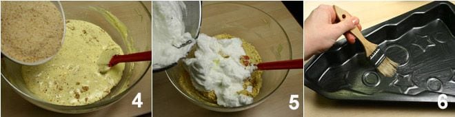 Incorpore então o pão ralado 4, misture bem e depois adicione as claras batidas em neve firme com o restante do açúcar 5. Unte e enfarinhe a forma onde vai assar o bolo 6.