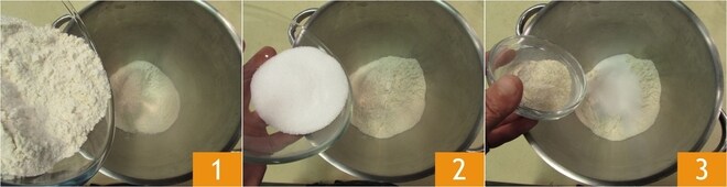 Para preparar os donuts, primeiro aqueça ligeiramente o leite que você usará para preparar a massa. Enquanto isso, coloque na tigela de uma batedeira equipada com gancho a farinha 00 e a farinha manitoba 1. Adicione o açúcar 2 ao fermento biológico com massa madre desidratada 3.