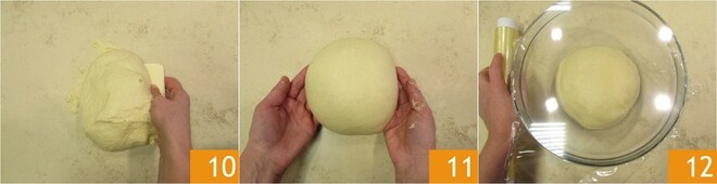 Solte a massa do gancho com as mãos ligeiramente umedecidas, depois use uma espátula para virá-la na bancada 10. Polvilhe com um pouco de farinha e dê à massa uma forma esférica, sempre ajudando-se com uma espátula para manusear mais facilmente 11. Transfira para uma tigela grande, previamente untada, cubra com filme plástico e deixe descansar por 2 horas no forno desligado com a luz acesa 12.