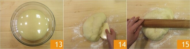Após o tempo de fermentação, a massa terá dobrado de tamanho. Transfira novamente para a bancada levemente enfarinhada 14 e estenda com o rolo 15.
