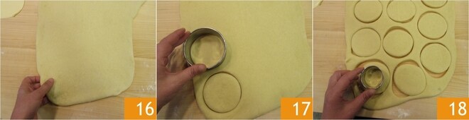 Você deve obter uma espessura de 1 cm 16. Usando um cortador de biscoitos com 8 cm de diâmetro, corte círculos da massa 17, posicionando-os bem próximos. Neste ponto, usando um cortador de biscoitos menor, de 4,5 cm, faça os furos das rosquinhas 18.