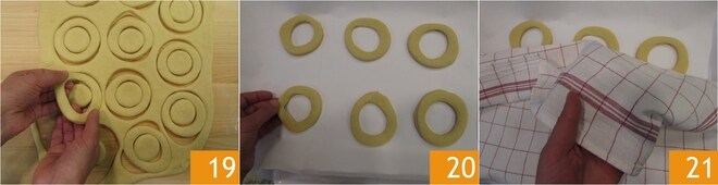 Levante delicadamente as rosquinhas 19 e coloque-as em quadrados de papel manteiga de cerca de 10 cm de lado colocados em uma bandeja 20; transfira para uma bandeja forrada com papel manteiga também os recortes de massa. Cubra as bandejas com um pano de prato 21 e deixe fermentar por 40 minutos longe de correntes de ar.