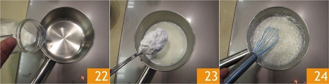 Quando as rosquinhas estiverem quase fermentadas, você pode se dedicar à cobertura. Transfira o leite para uma panela 22, aqueça e adicione o açúcar de confeiteiro 23. Mexa aos poucos com um batedor 24.