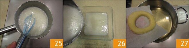 Cozinhe até que a mistura engrosse 25, transfira para uma tigela pequena 26 e deixe esfriar. Passe agora para a fritura. Aqueça o óleo de sementes em uma panela grande até atingir a temperatura de 175°. Quando o óleo estiver quente, levante a primeira rosquinha, ajudando-se com o papel manteiga, e mergulhe no óleo 27. Usando o papel manteiga, a forma não se modificará.