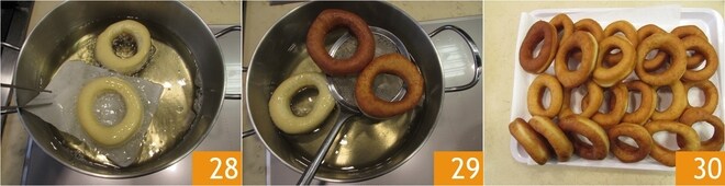 Após alguns segundos, você poderá retirar o papel manteiga usando uma pinça de cozinha 28. Vire-as de ambos os lados com uma escumadeira até que fiquem uniformemente douradas, levará cerca de 3 minutos 29, depois escorra em papel toalha 30. Mergulhe no óleo também os recortes e frite para obter os famosos buracos de donuts.