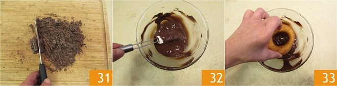 Enquanto as rosquinhas esfriam um pouco, você pode se dedicar a derreter o chocolate. Pique-o 31 e leve ao micro-ondas, ligando por poucos segundos de cada vez, até que esteja derretido 32. Alternativamente, você pode derreter o chocolate em banho-maria. Passe agora para a decoração. Mergulhe o primeiro donut no chocolate apenas pela metade 23.