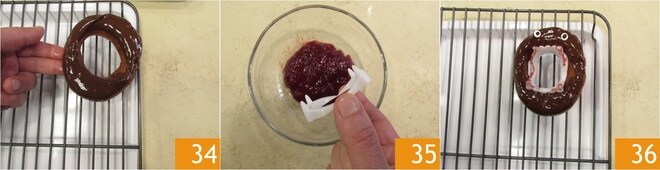 Levante-o e vire-o sobre uma grade 34. Suje dentes de plástico com a geleia 35 e coloque-os dentro do buraco da rosquinha. Decore também com os olhinhos 36.