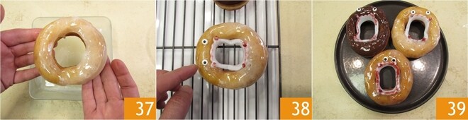 Faça agora o mesmo para decorar os donuts com a cobertura de leite. Mergulhe-os na cobertura, vire-os 37, transfira para uma grade e decore como acabou de fazer 38. Prossiga até terminar os ingredientes, deixe solidificar e sirva seus donuts vampiros 39!