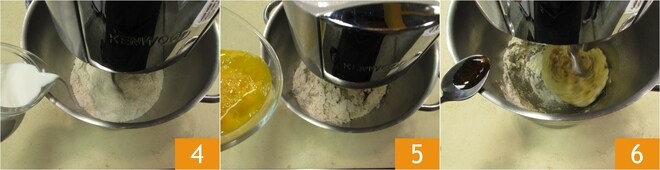 Ligue a batedeira em velocidade moderada e adicione o leite em fio 4. Adicione os ovos aos poucos para não sobrecarregar a massa 5 e aromatize com o extrato de baunilha 6.