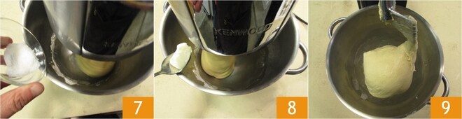 Por último, adicione também o sal 7 e continue a trabalhar até que a massa se desprenda das paredes da tigela e fique bem trabalhada. Neste ponto, você pode adicionar a manteiga amolecida, um pedaço de cada vez 8, certificando-se de que o anterior tenha sido bem absorvido antes de adicionar mais; levará cerca de 15-20 minutos. Você deve obter uma massa lisa e homogênea 9.