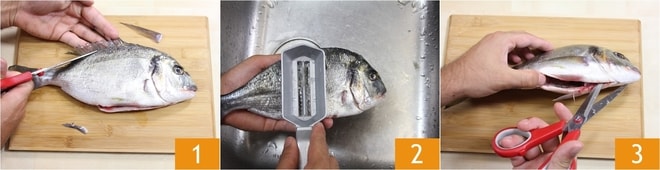 Para preparar a dourada assada, comece pela Como limpar a dourada: com uma tesoura, corte as barbatanas 1, depois descame-a sob água corrente usando o dorso da faca ou, se tiver, um utensílio específico para descamar peixe 2 ou com a lâmina de uma faca. Com uma tesoura, faça um corte no ventre da dourada, indo reto até abaixo da cabeça 3.